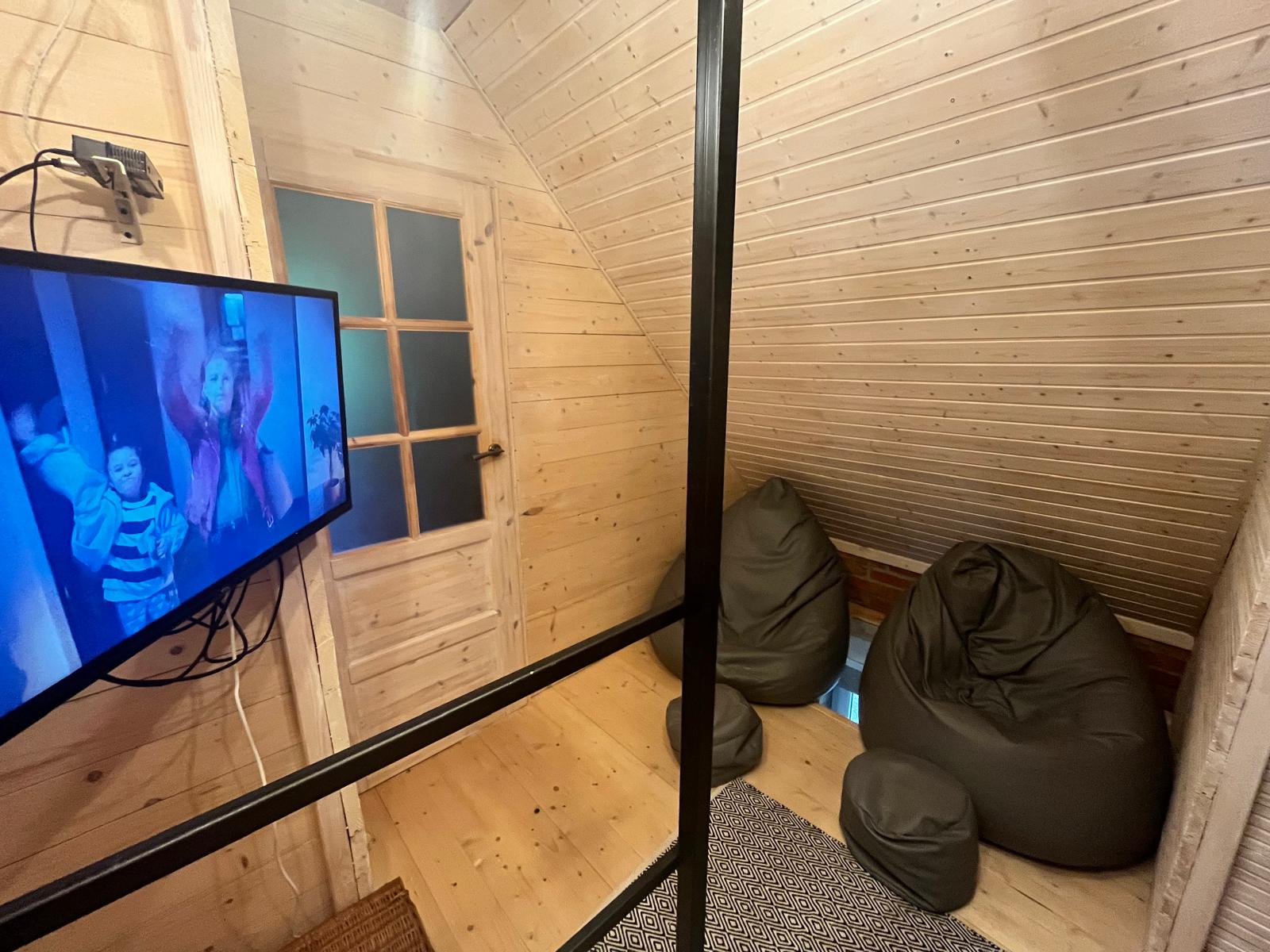 STREFA RELAKSU – Kącik jest wyposażony w pufy i telewizor.